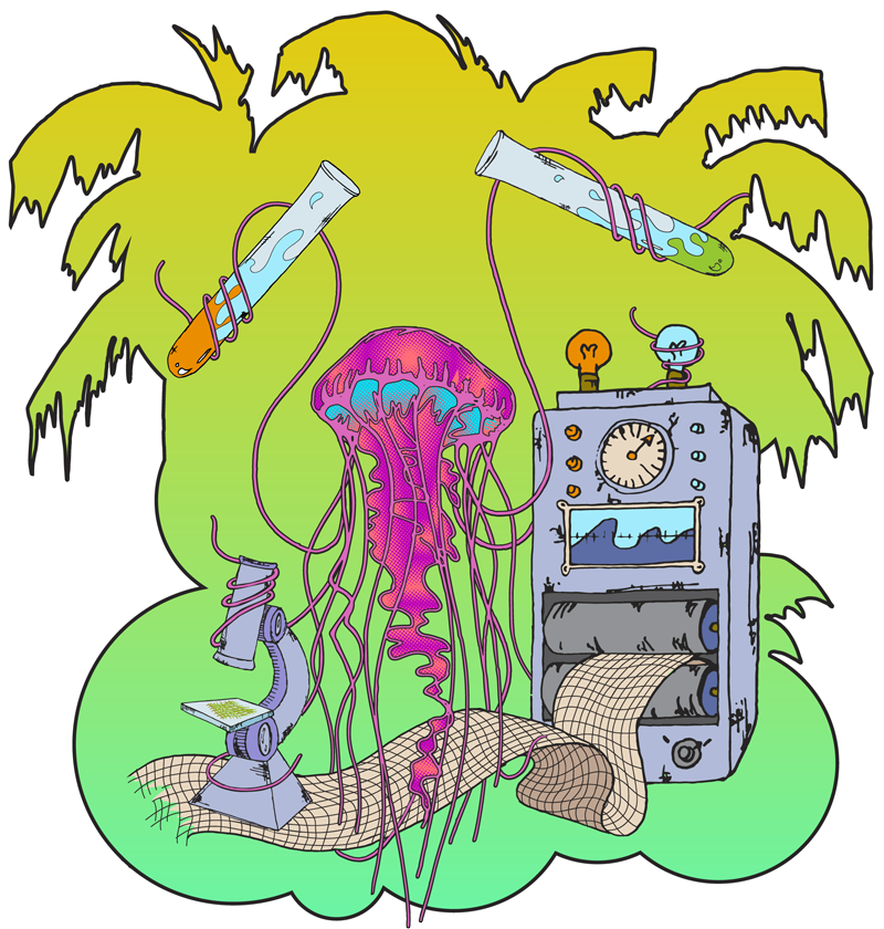 Lets take a trip to the art house where vibrant colours and deep sea creatures lurk. It’s here you’ll find Skulls and Islands creating original art works inspired by the tropics. Blissed out in their tropic surrounds inpiration is everywhere, electric jellyfish, turqoise seas, blue ring octopus—tall palm trees. Fabrics now laden with prints it’s time for the tiki taylor.