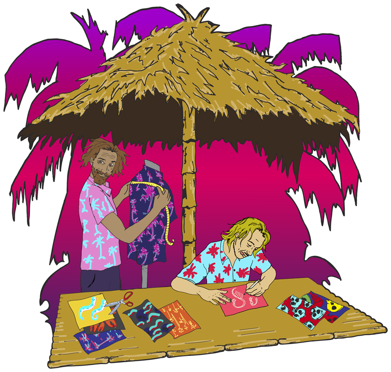 Well it all began many moons ago in an underground tiki hideaway where inhibtions were left at the door. This is where Sammy Skulls and Olly Islands would first meet and spend many a night entertaining an unusual and eccentric crowd. Tropically inspired, their lifelong obsession with the hawaiian shirt would begin. From print collectors to fabric addicts and on to stitching shirts, these lively garments kept the good times a rolling. It was time to make their own.
