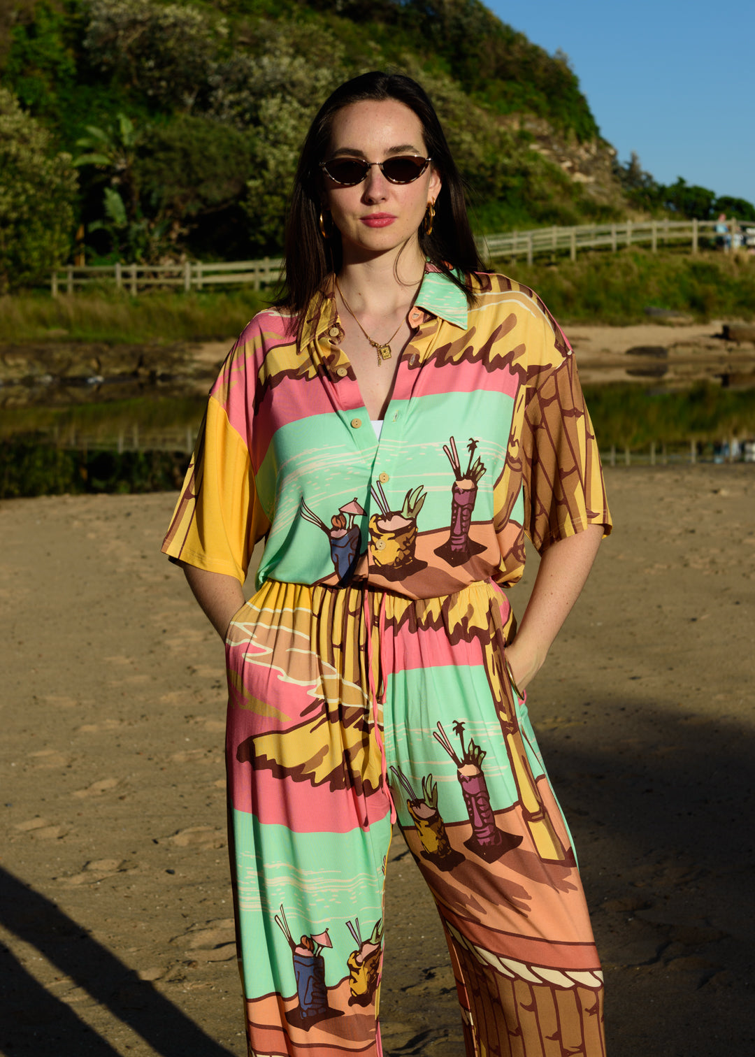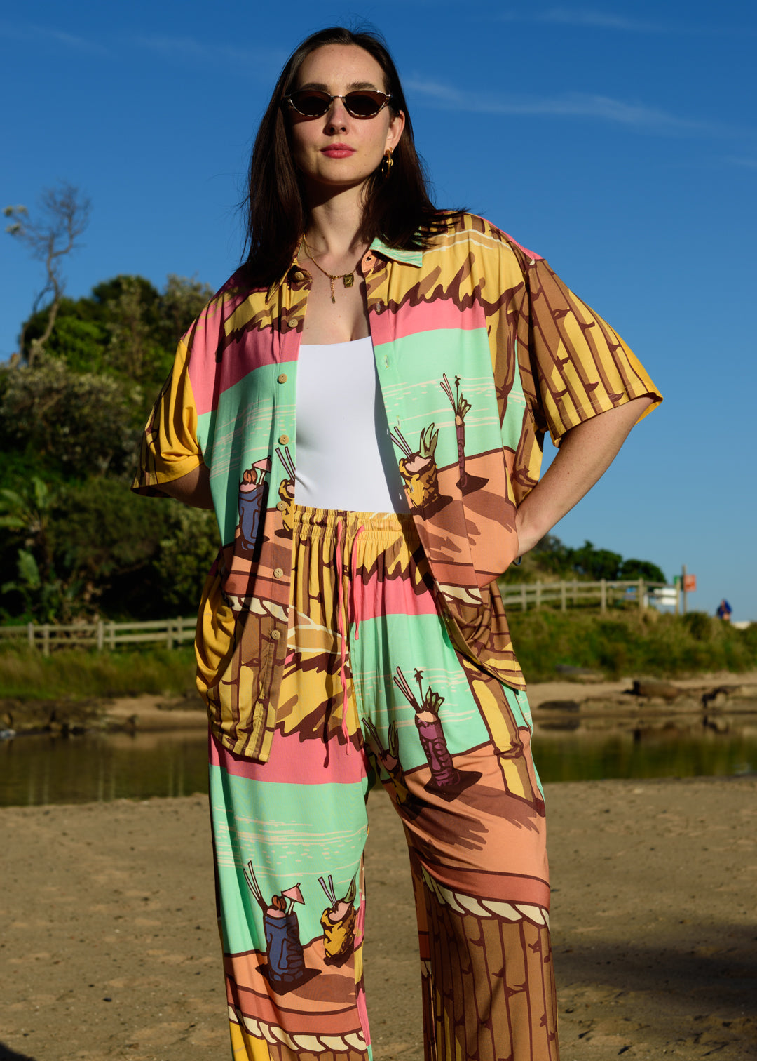 Model is 5'6/167cm tall with slim build and wears an M. Could easily wear An S or XS As fabric is stretchy. Model can be seen wearing an XS in the Tiki Beach print.